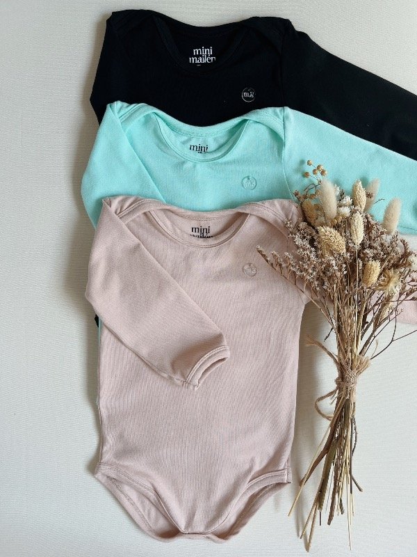 Bodys confeccionado en algodón peinado con lycra, de doble rebote, con elasticidad tanto en el ancho como en el tiro, lo que permite un calce cómodo y adaptable al cuerpo del bebé.